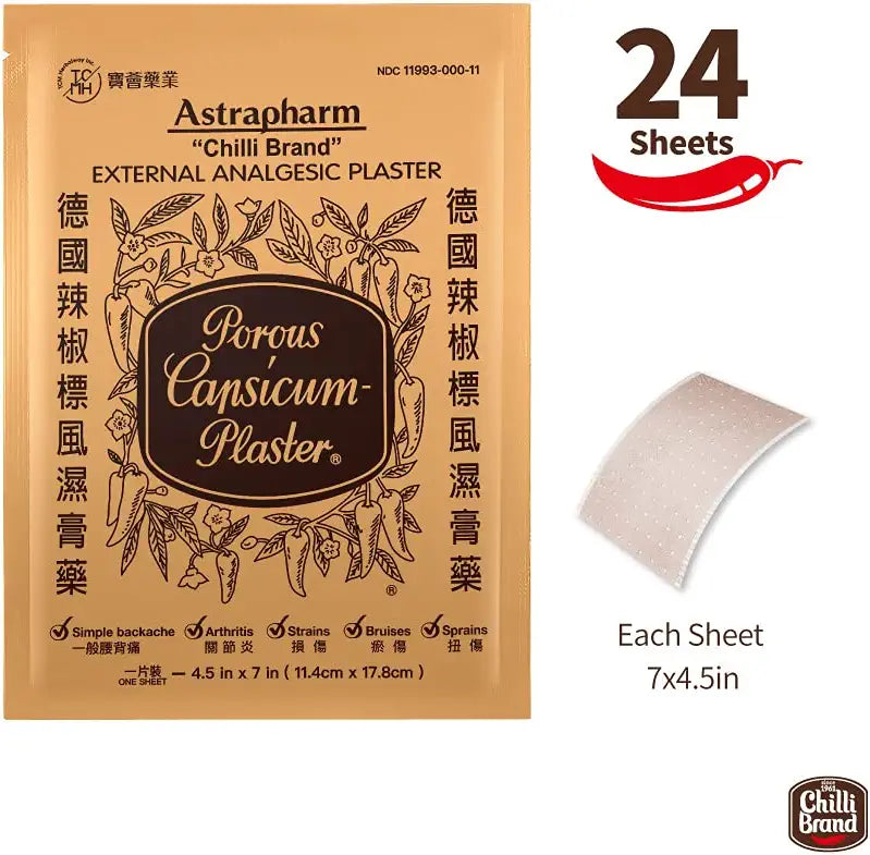 Experience targeted relief with Chilli Brand Capsicum Pain Plasters, formulated with natural capsicum extract to help alleviate muscle aches, joint pain, and stiffness. Ideal for daily discomfort from sports, work, or aging.
