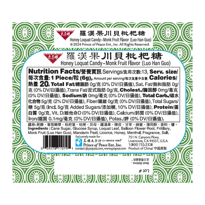 Honey Loquat Candy with Monk Fruit (Luo Han Guo), 76g | Prince of Peace®